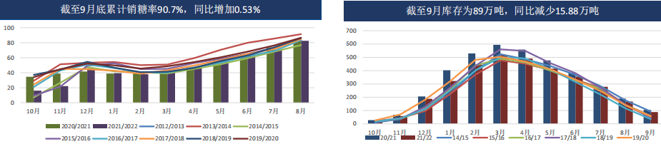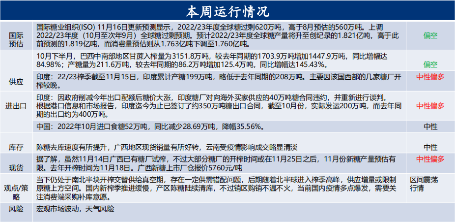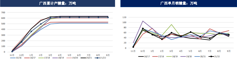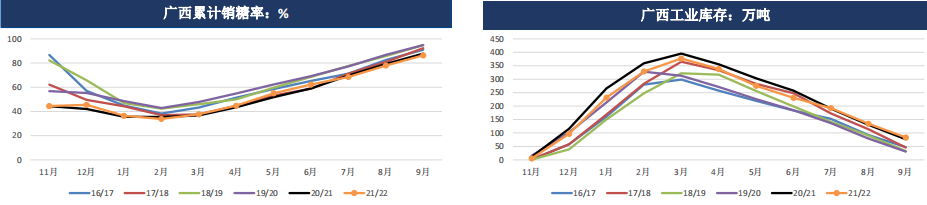 國內11月下旬開榨,廣西大部分糖廠的開榨時間或在11月25日之后,11月份新糖產量預估有限。去年開榨時間為11月18日。產區陳糖陸續清庫,不過銷區購銷不溫不火,當前國內疫情多點爆發,需要關注消費端采購補庫意愿。