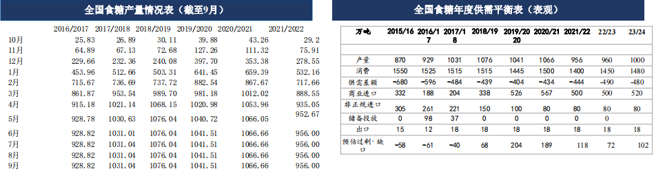 20/21榨季全國食糖產量在1066.66萬噸,同比去年小幅增加。2021/22榨季減產至960萬噸附近。