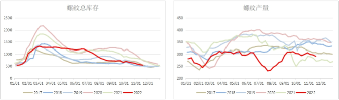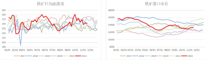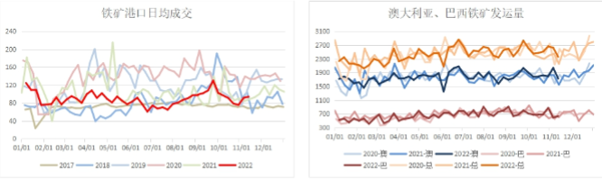 截止本周11月17日,螺紋產量290.67萬噸,較上周減少5.79萬噸,降幅1.95%;螺紋廠庫174.85萬噸,較上周減少6.06萬噸,降幅3.35%;螺紋社庫363.8萬噸,較上周減少15.23萬噸,降幅4.02%;螺紋表需311.96萬噸,較上周減少10.68萬噸,降幅3.31%;建材成交量均值162899,表需下滑明顯,受行業低利潤影響,產量繼續走低。鐵礦港口庫存小幅累庫至13319萬噸,累庫速度低于預期,鐵礦港口成交量小幅抬升,高爐開工率以及日均鐵水受淡季及低利潤影響繼續走低,分別下降至76.35%和226.35萬噸每天,鋼廠庫存保持低位,采購情緒不高,鐵礦到港量維持高位,基本面現實偏弱。