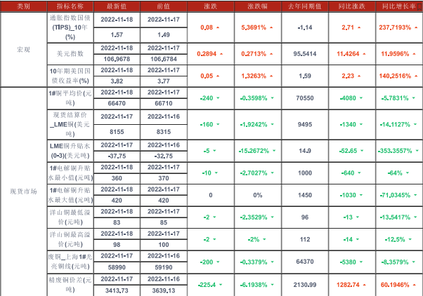 宏觀:美國10月未季調CPI年率錄得7.7%,同比增速創九個月新低。美國通脹數據回落,未來美國加息速度大概率會降低。這種預期使得美元走弱,對銅價構成支撐。不過隨若加息進入后半程,利率上行將對銅價構成壓力,市場預期也有可能會隨時轉變。