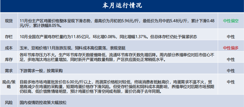 11月我們認為合約相對來說漲跌空間有限,11月需求淡季,現貨蛋價10月已經漲至高位,11月見頂回落,期貨受現貨影響缺乏大漲驅動,但飼料成本高企,疊加存欄相對偏緊以及期現價差處于同期高位,雞蛋大跌基礎不足,整體缺乏趨勢性行情,單邊/套利操作相對較難。建議觀望為主。從主力期貨走勢來看,表現比較符合。