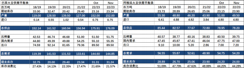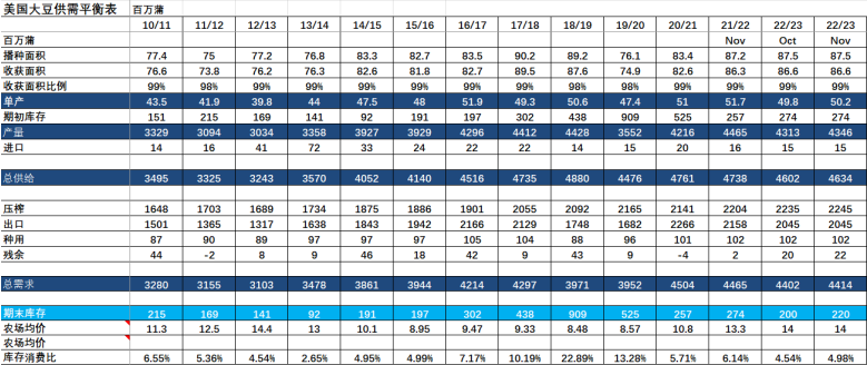 美國農業部11月數據:預計2022/2023年度巴西大豆種植面積增加3.3%,產量達到1.52億噸,較上年度增加2500萬噸,增幅19%;