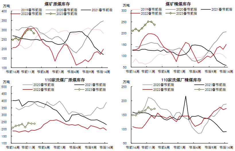 煤礦原煤庫存282.0萬噸(-18.6),煤礦精煤庫存237.3萬噸(-13.1),110家洗煤廠原煤庫存237.8(-0.6),110家洗煤廠精煤庫存171.6(+0.3)。
