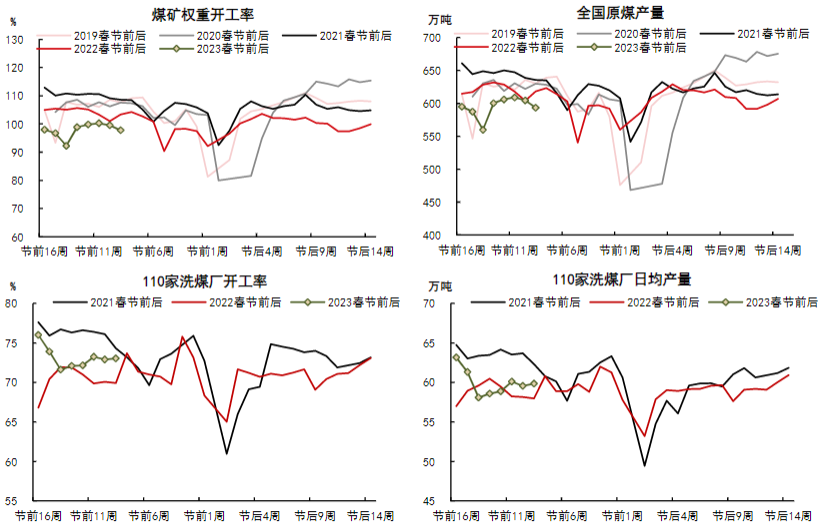煤礦權重開工率97.7%(-1.8%),原煤產量593.7萬噸(-10.9),110家洗煤廠開工率73.0%(+0.1%),110家洗煤廠精煤日均產量59.8萬噸(+0.2)。