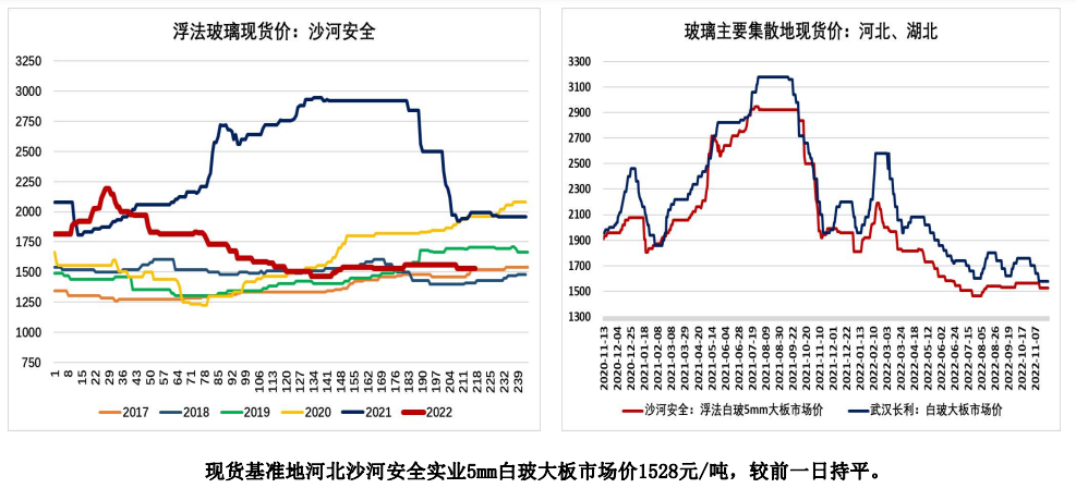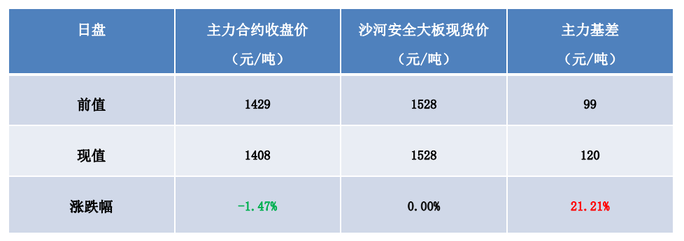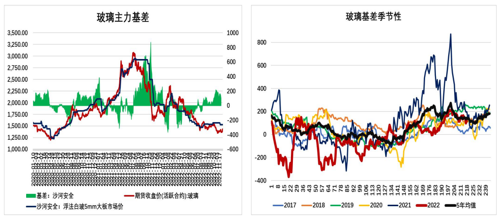2、基差:浮法玻璃河北沙河安全實業大板現貨1528元/噸,FG2301收盤價為1408元/噸,基差為120元,期貨貼水現貨;偏多。