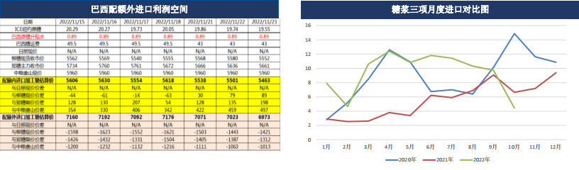 2022年11月23日,ICE原糖主力合約收盤價為19.55美分/磅。經測算,巴西配額內食糖進口估算成本為5463元/噸,與柳糖價差89元/噸,配額外食糖進口估算成本為6973元/噸,與柳糖價差-1312元/噸。