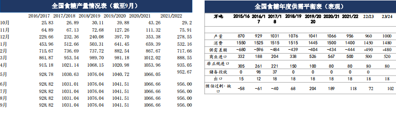 20/21榨季全國食糖產量在1066.66萬噸,同比去年小幅增加。2021/22榨季減產至960萬噸附近。