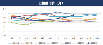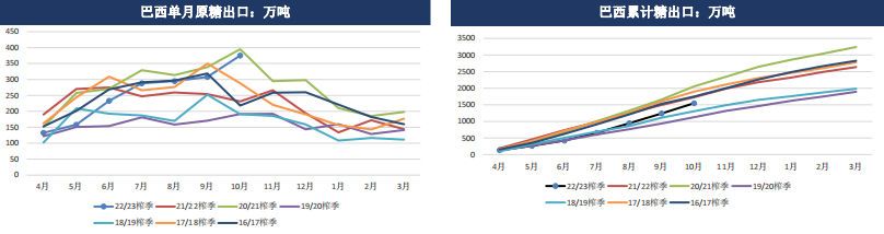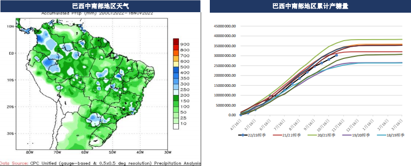 22/23榨季巴西降水前景改善,降水量同比去年增多,蔗料或將有一定恢復。從最新的巴西中南部機構Datagro預估來看,巴西中南部地區2022/23年度甘蔗壓榨量預計為5.62億噸,較去年受霜凍和干旱沖擊的5.25億噸產量相比有所增加。