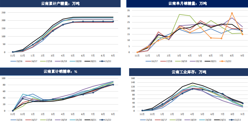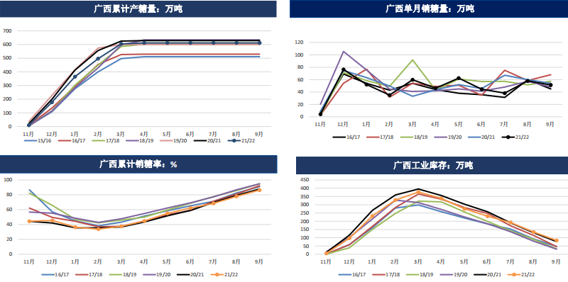 國內11月下旬開榨,廣西大部分糖廠的開榨時間或在11月25日之后,11月份新糖產量預估有限。去年開榨時間為11月18日。產區陳糖陸續清庫,不過銷區購銷不溫不火,當前國內疫情多點爆發,需要關注消費端采購補庫意愿。
