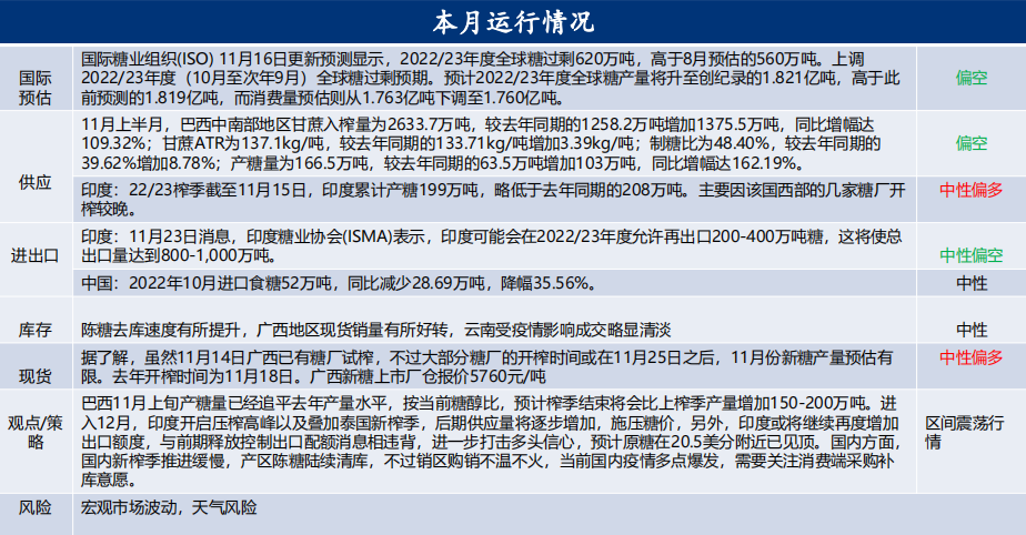 巴西11月上旬產糖量已經追平去年產量水平,按當前糖醇比,預計榨季結束將會比上榨季產量增加150-200萬噸。進入12月,印度開啟壓榨高峰以及疊加泰國新榨季,后期供應量將逐步增加,貿易流緊張狀況將緩解,另外,印度或將繼續再度增加出口額度,與前期釋放控制出口配額消息相違背,進一步打擊多頭信心,預計原糖在20.5美分附近已見頂。