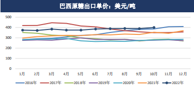 2022年,巴西10月出口糖375.01萬噸,同比增加60.8%。2022年4-10月巴西累計出口糖1801.24萬噸,同比增加6.11%。