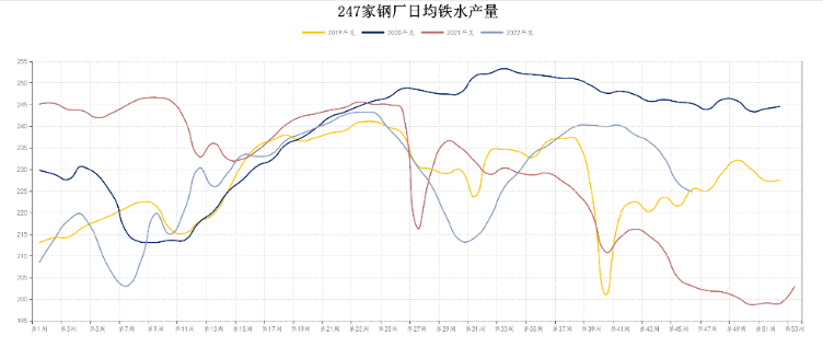 據mysteel數據,247家鋼廠高爐產能利用率82.52%,環比下降0.84%;日均鐵水產量222.56萬噸,環比減少2.29萬噸,與前值相比基本持平。
