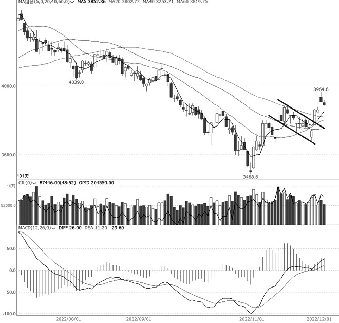 十債上周再度大幅下挫,自8月19日當周以來的雙頭形態頸線位100.5失守后,中期調整有望展開。日線上,11月11日展開快速下跌以來,小5浪走勢比較清晰,近3個交易日觸底反彈,期價收復5日均線壓力,有修復均線乖離率過大技術性反彈的可能。持倉成交季度萎縮,顯示空方進一步做空動能不足。綜合看,趨勢向下,短線存在修復反彈的可能。操作上,短線在5日均線不跌破前提下輕倉多單,待均線修復后,仍尋求阻力做空為主。(中原期貨 李衛紅)