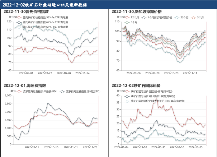 11月29日,58%Fe普氏價格指數為84.75美元/噸,較昨日上漲2.17%,62%Fe普氏價格指數為101.25美元/噸,較昨日上漲2.38%,65%Fe普氏價格指數為113.25美元/噸,較昨日上漲2.12%;11月29日,1個月新加坡掉期價格為100.78美元/噸,較昨日上漲2.69%,3個月為99.13美元/噸,較昨日上漲2.49%,6個月為97.30美元/噸,較昨日上漲2.54%,12個月為93.97美元/噸,較昨日上漲2.60%,23個月為88.84美元/噸,較昨日上漲2.73%。
