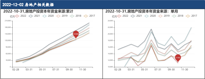 10月31日,房地產本年投資資金來源累計為125480.12億元,同比減少24.68%,單月為11182.05億元,較上個月減少17.05%,同比減少26.00%;房地產施工面積累計為888893.80萬平方米,同比減少5.72%,單月為9974.39萬平方米,較上個月減少2.89%,同比減少32.58%;房地產竣工面積累計為46564.58萬平方米,同比減少18.72%,單月為5685.61萬平方米,較上個月增加41.51%,同比減少9.43%;房地產銷售面積累計為111179.29萬平方米,同比減少22.27%,單月為9757.57萬平方米,較上個月減少27.89%,同比減少23.22%。