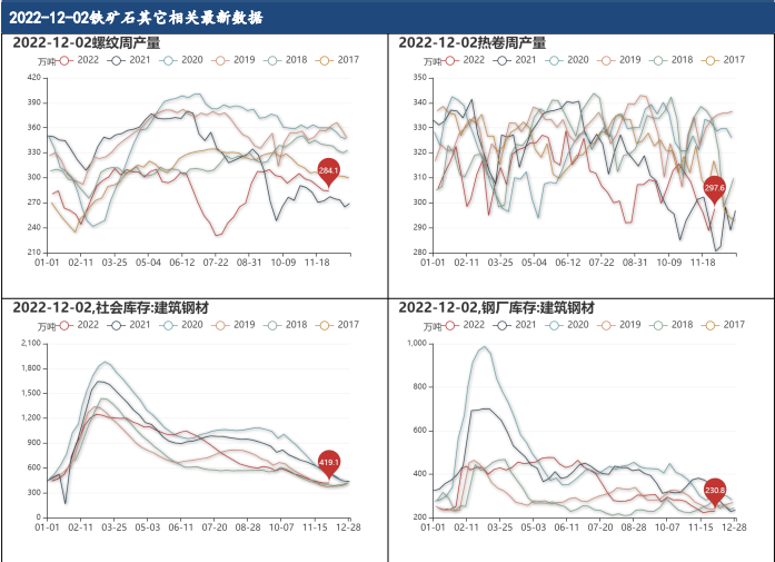 12月2日,247家鋼廠高爐開工率為75.61%,較上周減少1.84%,產能利用率為82.62%,較上周增加0.12%,日均鐵水產量為222.81萬噸,較上周增加0.11%;11月20日,粗鋼日均產量為200.20萬噸,增加0.77%。12月2日,45港鐵礦石庫存為13277.81萬噸,較上周減少1.53%,同比減少12.94%;41港鐵礦石庫存為12750.81萬噸,較上周減少1.65%;澳洲庫存為5657.65萬噸,較上周減少0.10%;巴西庫存為4526.04萬噸,較上周增加0.71%。