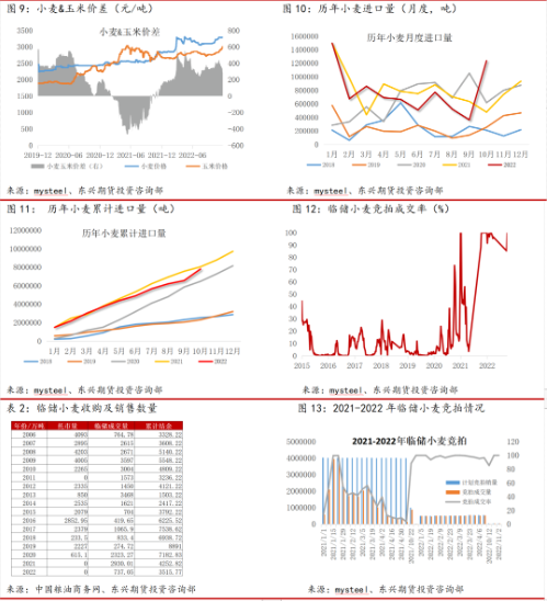 2022年4月共進行2場次政策性小麥拍賣,分別于4月6日及4月13日,計劃競拍銷量總計1,104,298噸,競拍成交量1,059,091噸,成交率分別為95.38%,96.44%。隨后政策性小麥拍賣停止,直至10月12日恢復,10月份共進行2次政策性拍賣,分別在10月12日及10月19日。10月12日計劃銷售數量12509噸白小麥(高寒),全部成交,最高價2870元/噸,最低價2060元/噸,均價2724元/噸,較上期下跌48元/噸。計劃銷售數量27517噸白小麥(非高寒),全部成交,最高價3030元/噸,最低價2500元/噸,均價2876元/噸,較上期下跌25元/噸。10月19日計劃銷售40026噸,成交比率100%,平均價2829元/噸。作為對比,上期4月13日新疆地區投的國家臨儲小麥,最高成交價2500元/噸,成交均價2420元/噸。可見市場主體競搶激烈,成交火爆,溢價幅度大。11月2日國家臨儲小麥計劃成交40476噸,成交比率100%,成交均價2865元/噸,周比上漲22元/噸。