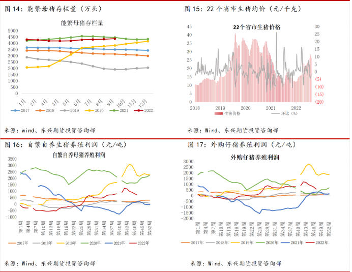 2022年9月份能繁母豬存欄為4362萬頭,環比增加38萬頭,增幅0.88%,同比減少97萬頭,減幅2.18%。2022年10月豬價顯著上漲,波動區間在26——29元。自繁自養母豬與仔豬養殖利潤本月持續下降,截止11月25日第47周能繁母豬養殖利潤706.41元/頭,較10月底1175.24元/頭減少468.83元/頭;外購仔豬養殖利潤578.5元/頭,較10月底1169.33元/頭減少590.83元/頭。