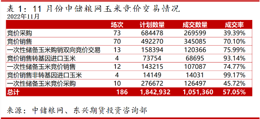 2022年11月1日-30日中儲糧網共進186場玉米競價交易,其中玉米競價采購交易73場,計劃采購數量684,478噸,實際成交數量269,599噸,成交率39.39%。玉米競價銷售交易70場,計劃銷售數量492,270噸,實際成交數量345,085噸,成交率70.1%。一次性儲備玉米購銷雙向競價交易13場,計劃交易數量158,394噸,實際成交數量120,366噸,成交率75.99%。競價銷售轉基因進口玉米4場,計劃銷售數量73,754噸,實際成交數68,695噸,成交率93.14%。一次性儲備玉米競價銷售交易12場,計劃銷售數量143,215噸,實際成交數量107,087噸,成交率74.77%。競價銷售非轉基因進口玉米4場,計劃銷售數量14,149噸,實際成交數量14,031噸,成交率99.17%。一次性儲備玉米競價采購交易10場,計劃采購數量276,672噸,實際成交數量126,497噸,成交率45.72%。本月競價場次明顯增多,其中采購場次及計劃數量罕見超過銷售,成交率達4成左右,帶動市場情緒。