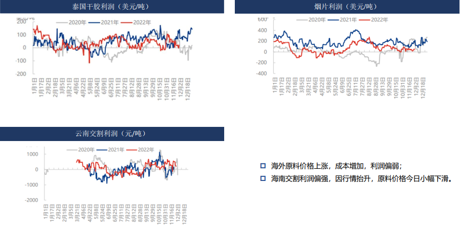 泰國產區:泰國原料價格膠水44.1泰銖/公斤,杯膠38.8泰銖/公斤,原料價格持穩,成本端對天膠行情存利好支撐;