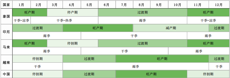 泰國和馬來季節相關度高,11月-次年2月是高產季,3-5月停割,6-10月為產量回升的過度季節。