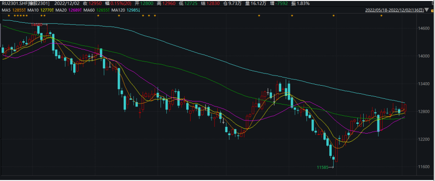 宏觀利好頻出,近期關于防疫政策的利好消息拉動商品集體反彈,美聯儲放緩加息步伐進一步利好外圍宏觀,內外共振下市場心態偏樂觀,在此基礎上01倉單注冊速度偏慢便有了炒作驅動,預計盤面繼續偏強震蕩。基本面來看,底云南產區全面停割,但替代指標進入后供應偏高。輪胎廠庫存高位,內需低迷,基本面依然偏弱。但近期宏觀利好頻出,宏觀氛圍拉動商品集體反彈,資金交易主邏輯偏多為主,缺乏主邏輯,預計盤面繼續震蕩為主。