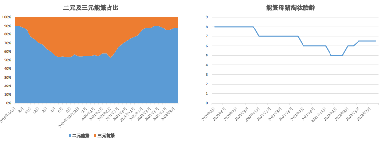 根據涌益咨詢數據顯示,當前市場二元、三元占比分別為88%與12%,二元及三元基本穩定在9:1的正常比例區間內。截至8月,涌益樣本下二元能繁母豬淘汰胎齡為6-7胎,較上月持平。正常區間一般在6-8胎。