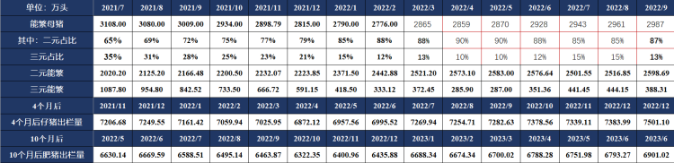 表格為根據農業部能繁母豬存欄測算的肥豬出欄量,由此可見未來生豬出欄量維持持續上漲格局。