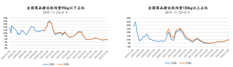 出欄體重:全國商品豬出欄均重90kg以下及150kg以上占比