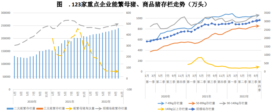 截至9月30日,生豬存欄量44394萬頭,較6月環比上升3.11%,同比增長1.44%;截至2022年9月底,能繁母豬存欄為4362萬頭,環比上升0.88%;我的農產品調查重點企業能繁母豬10月底存欄量為503.51萬頭,環比增2.81%;商品豬存欄3069.96萬頭,環比增1.37%。