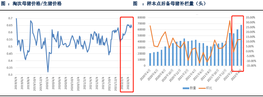 具體而言,4月以來,隨著生豬價格的快速上漲,養殖戶淘汰意愿減弱,雖然市場關于養殖戶淘汰意愿的信息過于碎片化,難以具體量化整體,但整體而言,二者隨著一般最終流入終端消費渠道,存在一定的替代性,通過觀測淘汰母豬與生豬的比價關系即可一定程度反應市場的淘汰壓力,當二者比值越高時則說明母豬在市場貨源表現中更加緊缺,可以看到自2月以來,二者比價關系由0.5左右持續上漲至0.65附近,并在4-5月期間一直維持高位,一定程度驗證了養殖戶淘汰意愿減弱的情況。