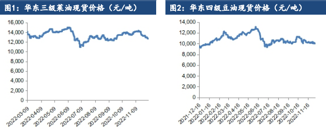 東莞中儲庫,24度,現貨,01+130。華南不定庫,24度,12月船,01+250。東莞不定庫,18度,現貨,01+260。華東三級菜油報價:01+600元/噸(3-5月中禾庫套餐),華東一級:01+2400(現貨),01+2000(12月中下旬)。兩廣不定庫,三菜OI205+650,2-5月。華東三豆基差報價:Y2301+780元/噸(12-1月),Y2305+760元/噸(2-5月)。