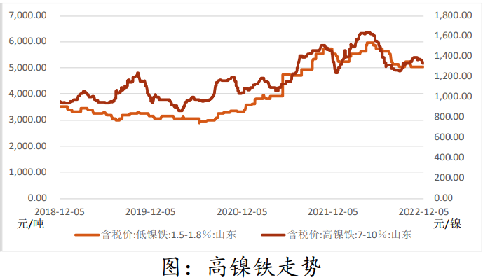 12月7日,SMM8-12%高鎳生鐵均價1337.5元/鎳點(出廠含稅),較前一交易日均價持平。供給端,11月大部分鎳鐵廠由于鋼廠減產,鎳鐵需求疲弱,而隨之產量有所下降。12月鎳鐵雖由于鐵廠主動減產,庫存有所下降,但較正常狀態,庫存仍然偏多,供應過剩。