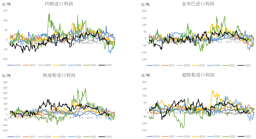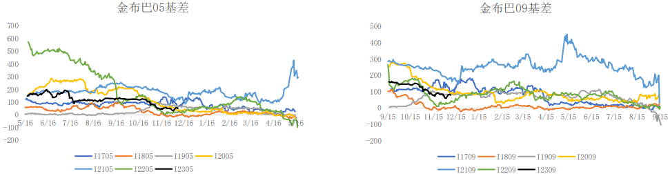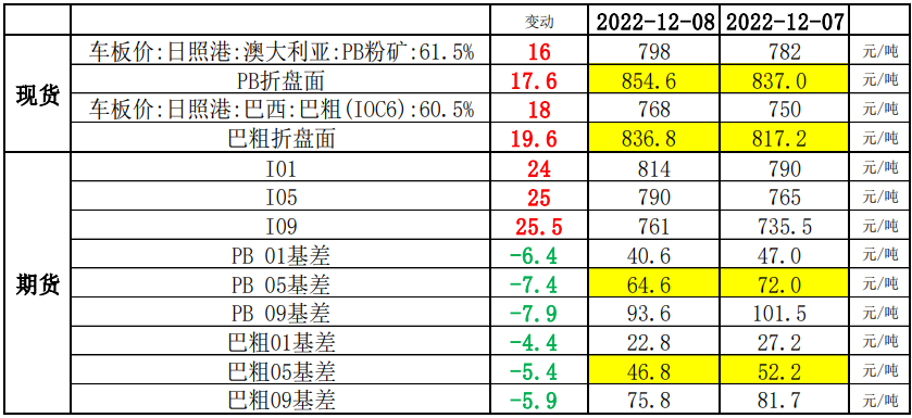 日照港PB粉現貨798,折合盤面854.6,05合約基差64.6;日照港巴粗現貨768,折合盤面836.8,05合約基差46.8,盤面貼水。