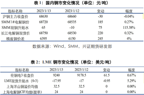 庫存方面,截至 1 月 13 日,SMM 全國主流地區銅庫存環比周一增加1.3 萬噸至 13.55 萬噸,較上周五增加 1.8 萬噸。從12 月末開始全國庫存已經連續 3 周增加,下游消費不佳是主因。