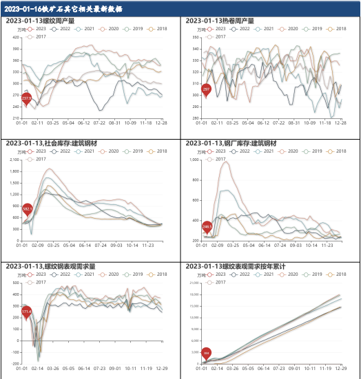 1月13日,建筑鋼材總庫存為828.60萬噸,較上周增加87.51萬噸,已連續增加5周,建筑鋼材社會庫存為582.14萬噸,較上周增加74.76萬噸,已連續增加5周,建筑鋼材鋼廠庫存為246.46萬噸,較上周增加12.75萬噸。周產量為237.91萬噸,較上周減少9.84萬噸,已連續減少6周,熱軋板卷周產量為297.04萬噸,較上周減少4.07萬噸,已連續減少3周。螺紋表觀需求為171.43萬噸,較上周減少40.64萬噸,已連續減少5周,螺紋表觀需求年累計為383.50萬噸,同比增加41.57%。