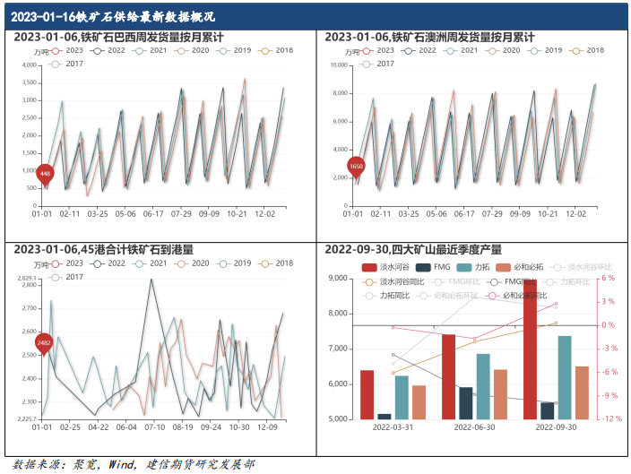 1月6日,鐵礦石澳大利亞月累計發貨量為1649.50萬噸,鐵礦石巴西月累計發貨量為447.50萬噸,鐵礦石國內到港量為2482.40萬噸,較上周減少199.90萬噸,已連續減少2周。