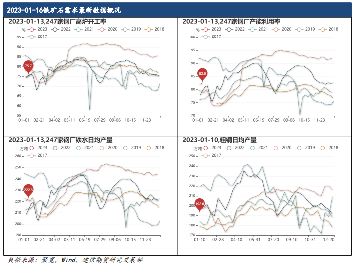 1月13日,247家鋼廠高爐開工率為75.68%,較上周增加1.39%,產能利用率為82.56%,較上周增加0.77%,日均鐵水產量為222.30萬噸,較上周增加0.72%;1月10日,粗鋼日均產量為192.57萬噸,增加0.51%。