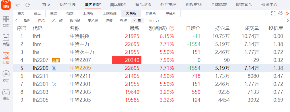 7月04日,生豬2209合約資金1.69億元,收于22695,漲幅達到7.71%。生豬市場情緒高漲,期股聯動,生豬主力合約今日盤中漲停,開板后依舊收于高位,成交量較之前放大一倍。