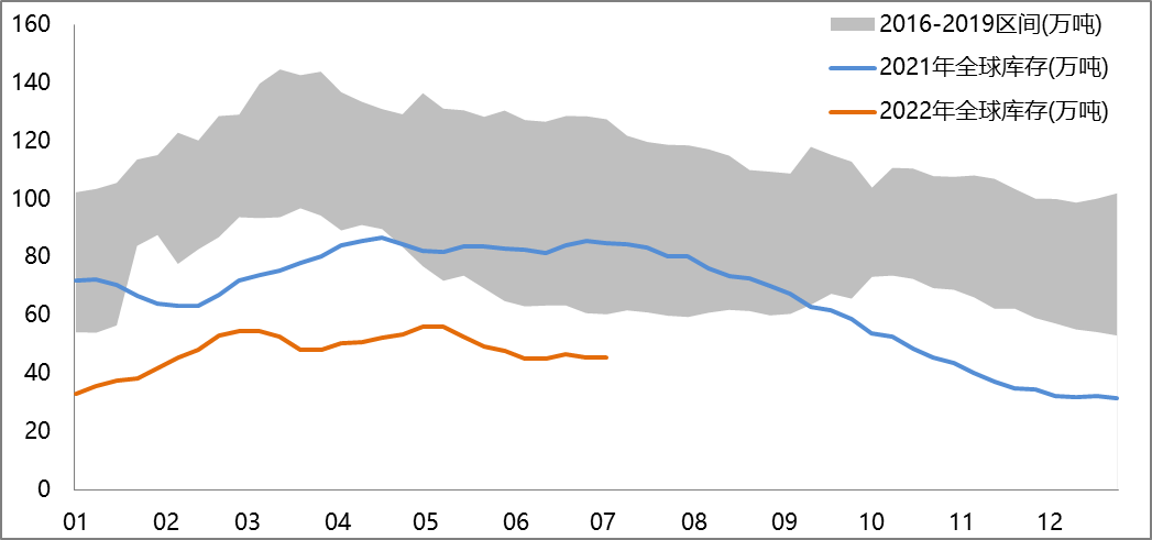 截止2022年7月8日當周全球顯性庫存環比上周微增0.1萬噸至45.54萬噸,其中上期所庫存+0.27萬噸,LME庫存+0.62萬噸,保稅區庫存-0.4萬噸,COMEX庫存-0.35萬噸。