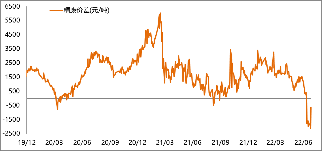 截止2022年7月8日精廢價差為-640元/噸,精銅價格優勢凸顯。