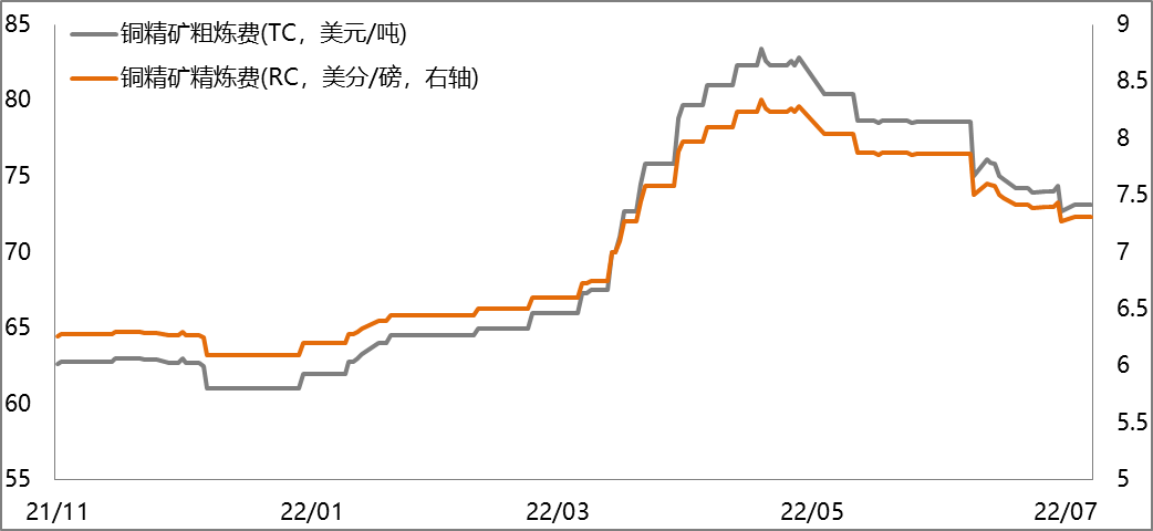截止2022年7月8日,銅精礦粗煉費為73.1美元/噸,較上周回升0.4美元/噸。