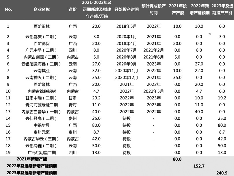 表為2022年及遠期中國新增電解鋁產能(2022年6月10日更新)