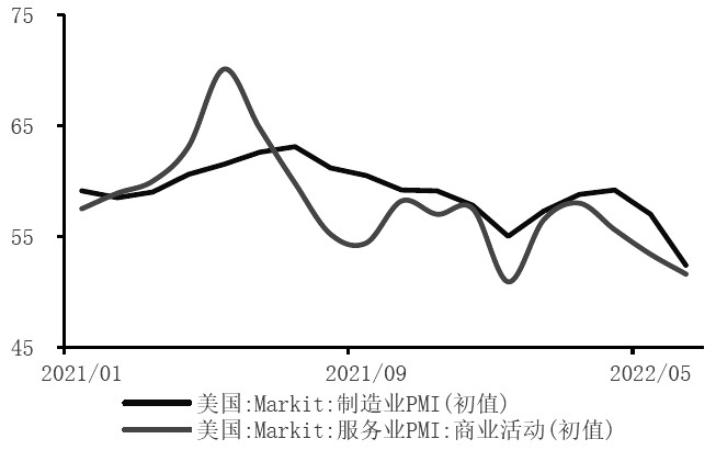 美國居民超額儲蓄已經耗盡,加息將會抑制后續消費需求,投資特別是地產投資同樣會明顯受到利率上行的抑制,6月,美國經濟景氣數據大幅走低,衰退預期持續發酵。高通脹與持續加息之下,消費者信心也持續走弱。美聯儲的加息預期,疊加景氣指標與信心指數大幅走弱,使得市場對經濟衰退的擔憂持續發酵。