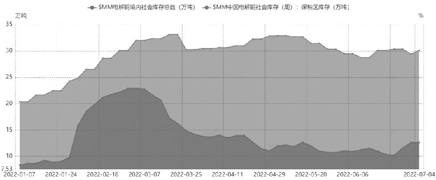 數據顯示,截至7月1日,LME銅庫存為12.7萬噸,COMEX銅庫存為7.4萬噸,上期所銅庫存為6.7萬噸,整體來看全球銅顯性庫存已脫離2021年底的低點,處于中等偏下水平。國內銅社會庫存為12.64萬噸,保稅區庫存為30.12萬噸,亦從低位回升。