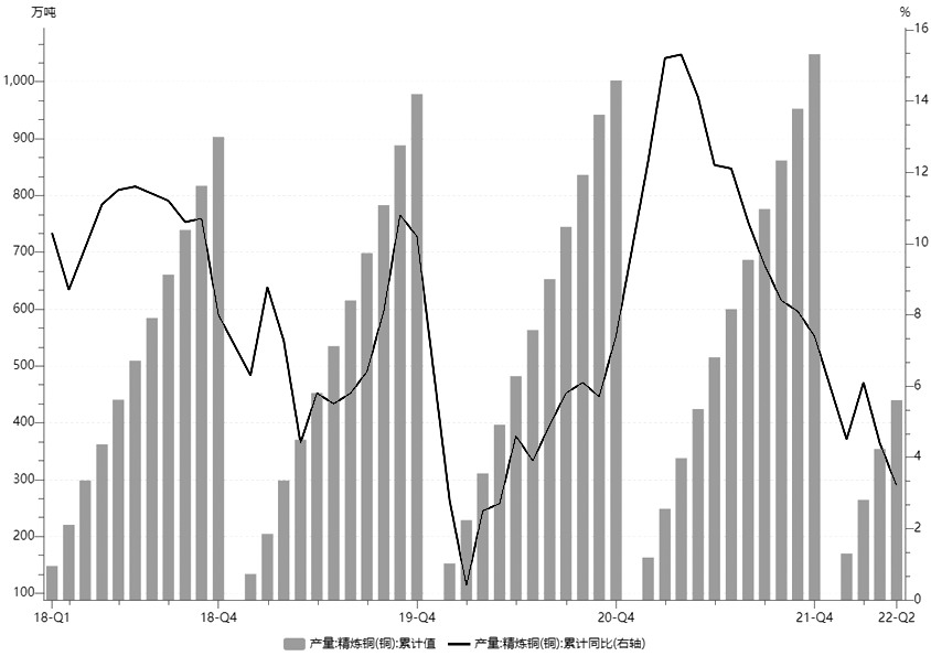 據ICSG數據,2022年1—4月全球精煉銅產量累計為844.3萬噸,累計同比增長3.22%。國內方面,2022年1—5月我國精煉銅產量累計為440萬噸,累計同比增加3.2%。上半年國內冶煉廠集中檢修,以及部分冶煉廠意外停產致精煉銅增量不大,不過目前銅精礦加工費處于高位,疊加硫酸價格高企貢獻較多收益,在利潤驅動下,下半年國內精銅產量或集中釋放,新增產能亦集中在下半年投產。市場預計2022年我國電解銅產量為1045萬噸,增速為4.7%左右,新增產能約113萬噸。
