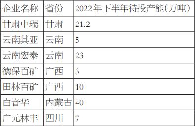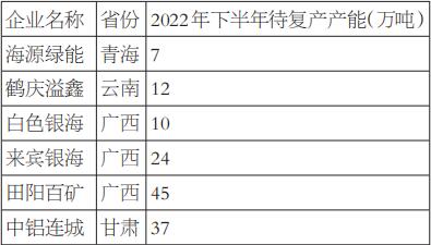 表為2022年下半年待復產產能