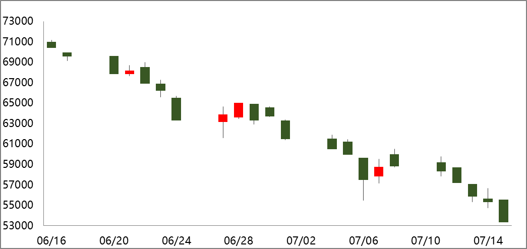 滬銅合約為CU2208,上周收盤價下跌9.29%至53480元/噸。