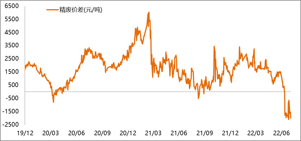 截止2022年7月15日精廢價差為-1920元/噸,精銅價格優勢凸顯。