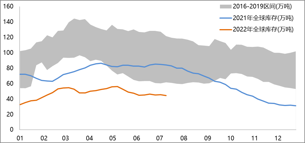 截止2022年7月15日當周全球顯性庫存環比上周下降1.15萬噸至44.38萬噸,其中上期所庫存+0.2萬噸,LME庫存-0.26萬噸,保稅區庫存-0.7萬噸,COMEX庫存-0.39萬噸。